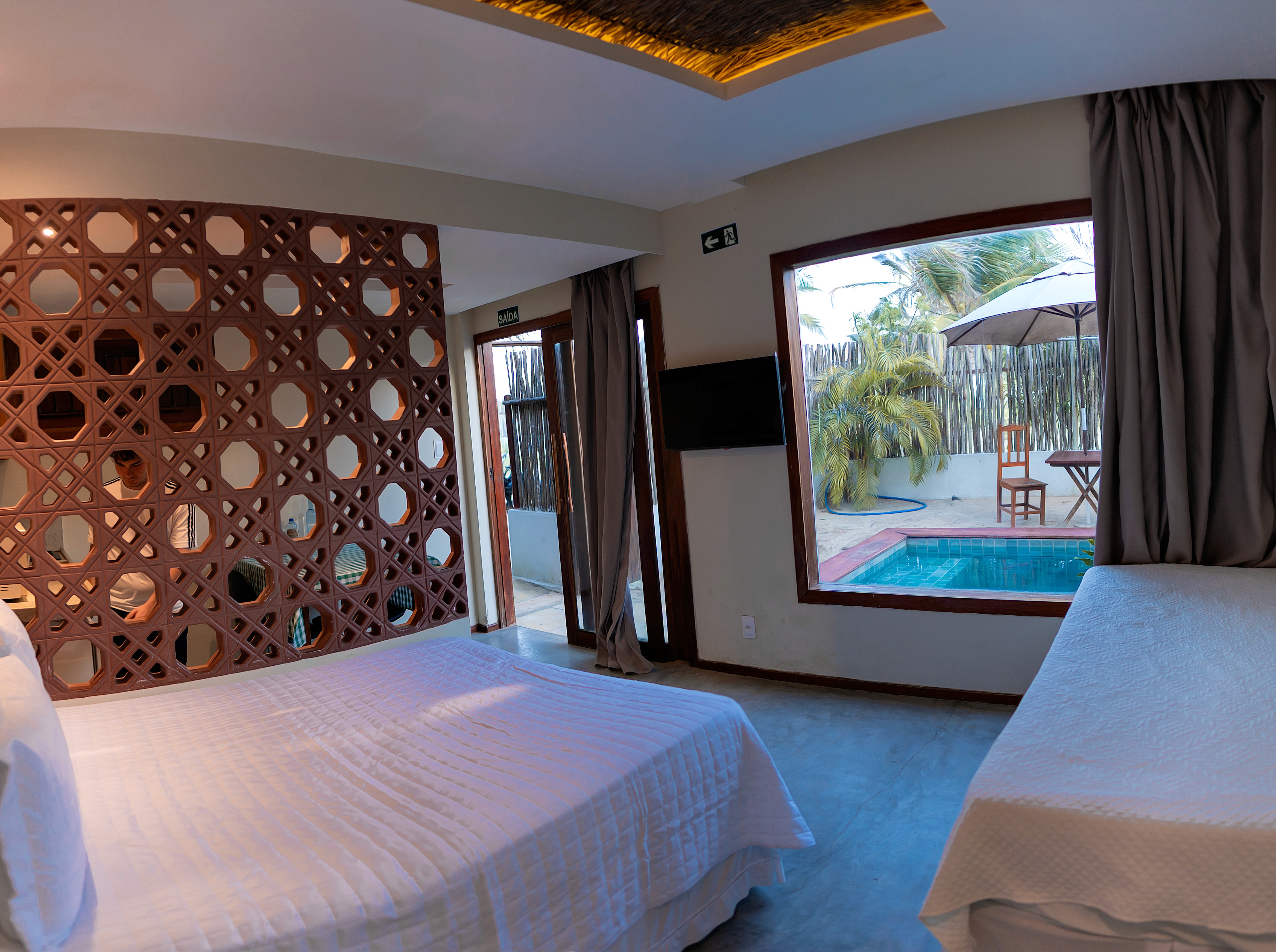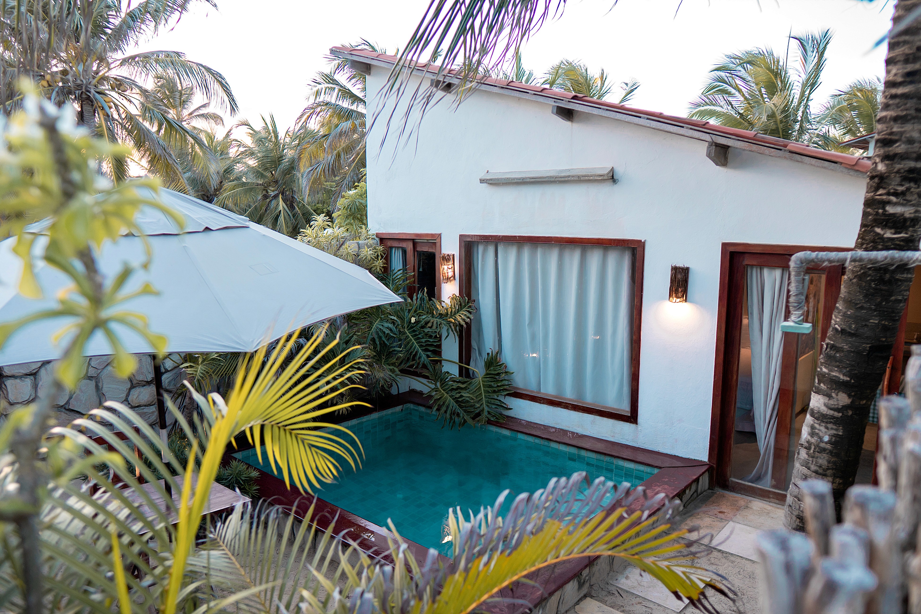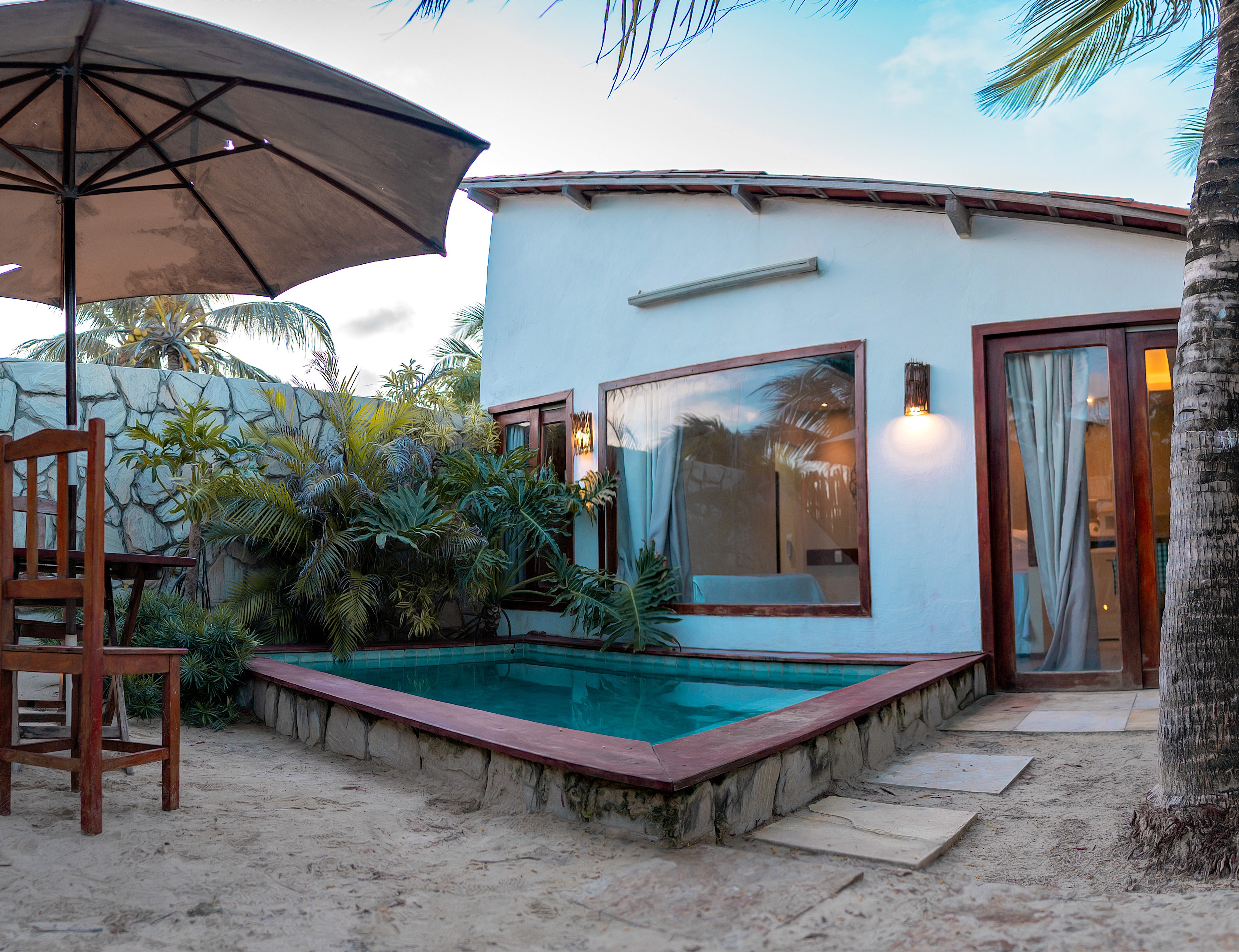 Chalé com piscina privativa e jardim com pequena piscina/hidromassagem, ideal para casais. Há a possibilidade de reservá-lo integrado ao bangalô Tropical 1, mas para essa opção, o cliente deve buscar essa informação com o atendimento de reservas.