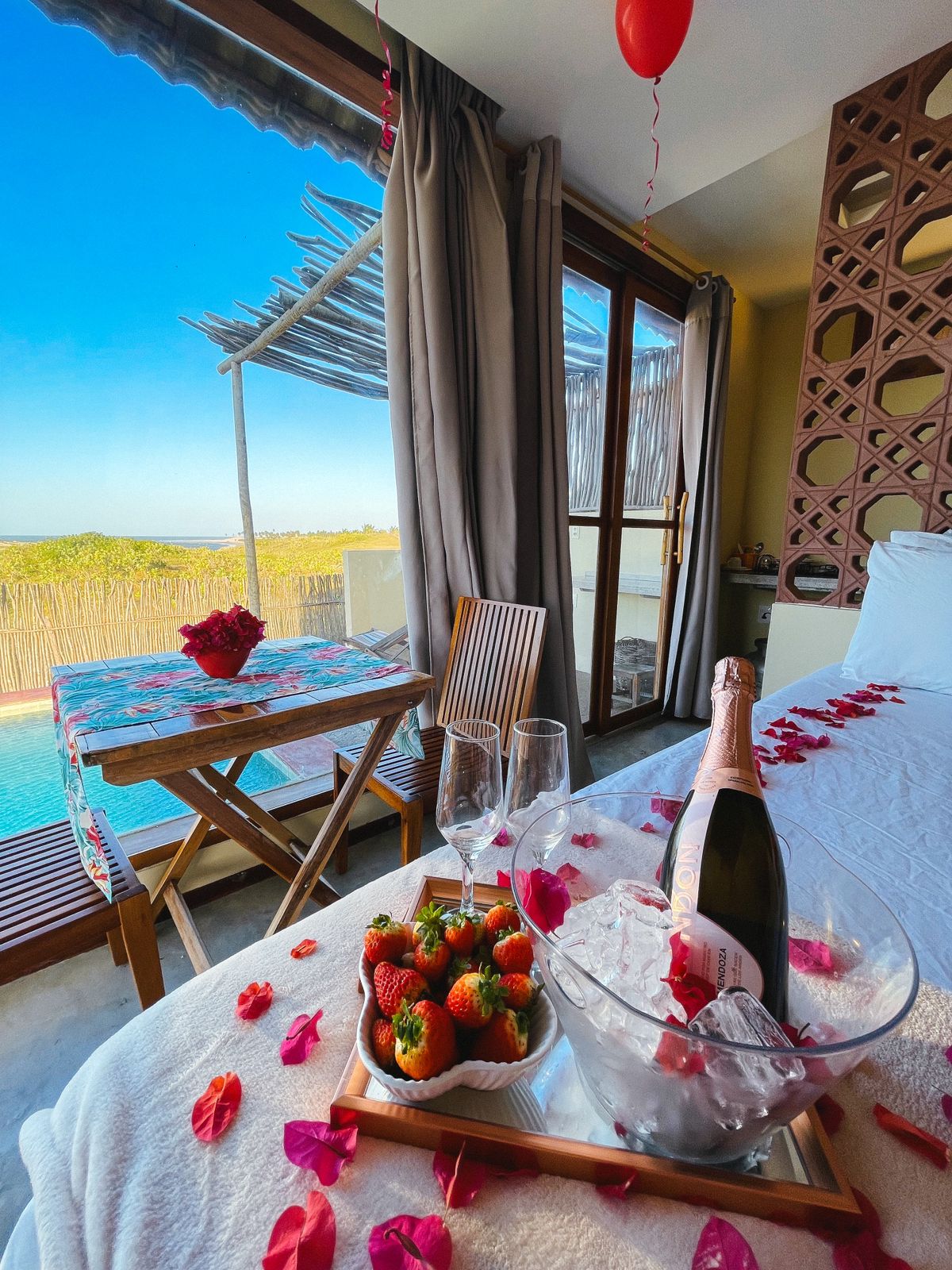 Funciona de forma simples: enviamos o cardápio com antecedência, vocês escolhem os pratos desejados e nossa equipe cuida de tudo — desde o preparo até o serviço, diretamente no seu bangalô.